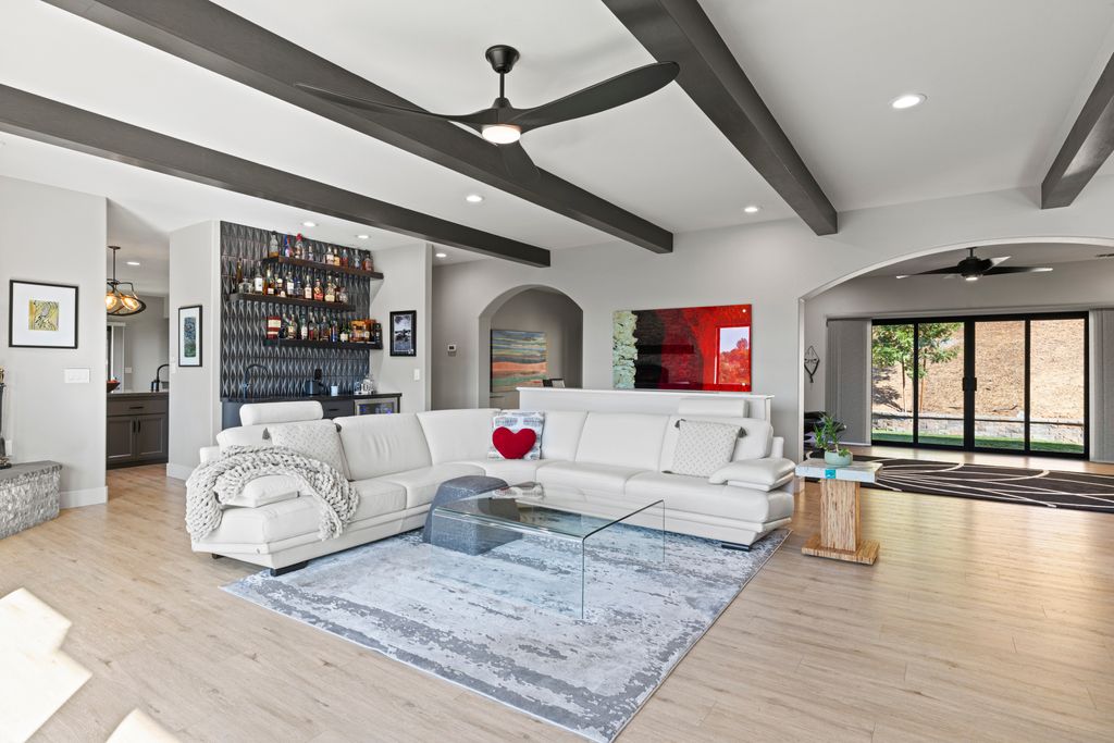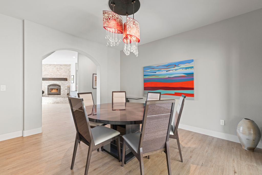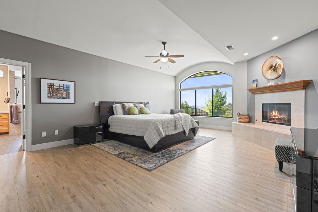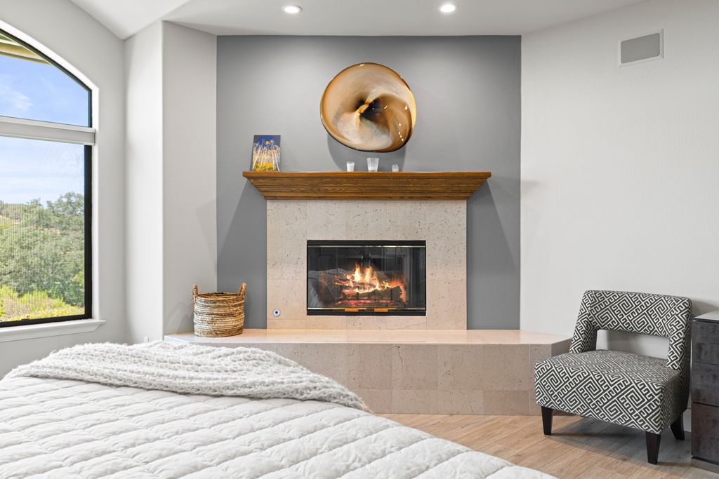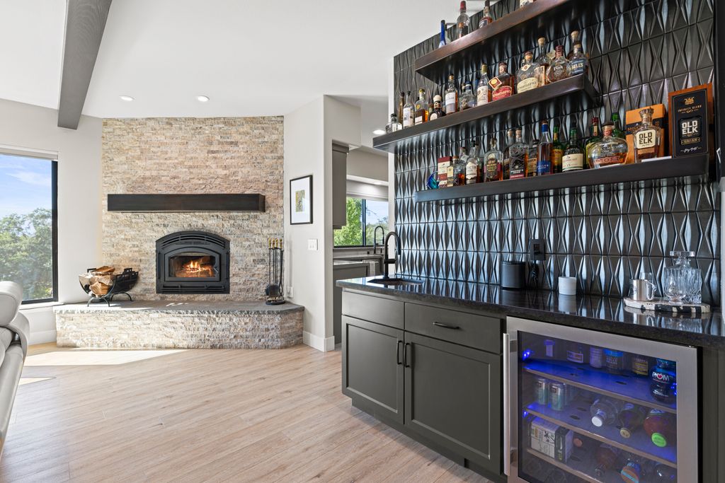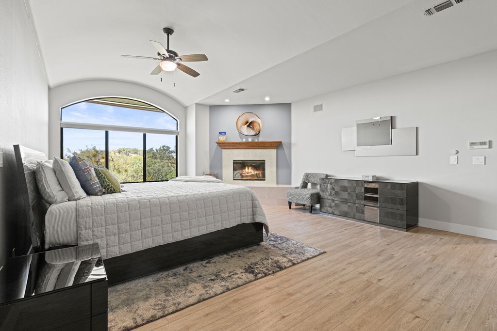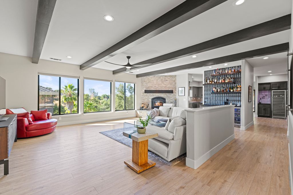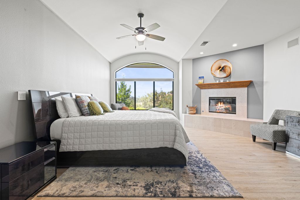 Designed for entertaining and everyday living, the living room features a wood-burning fireplace & built-in bar, flowing seamlessly into the family room, formal dining, & chef’s kitchen. The kitchen is complete with stainless steel appliances, large prep island, walk-in pantry, wine fridge, & adjacent laundry room. The private bedroom wing includes 3 guest rooms (one en-suite) & a luxurious primary suite with its own fireplace, spa-like bath with heated floors, view-framing walk-in shower, & a custom closet.