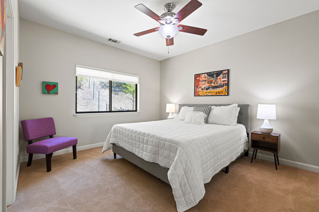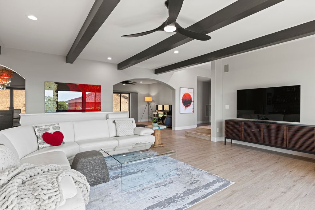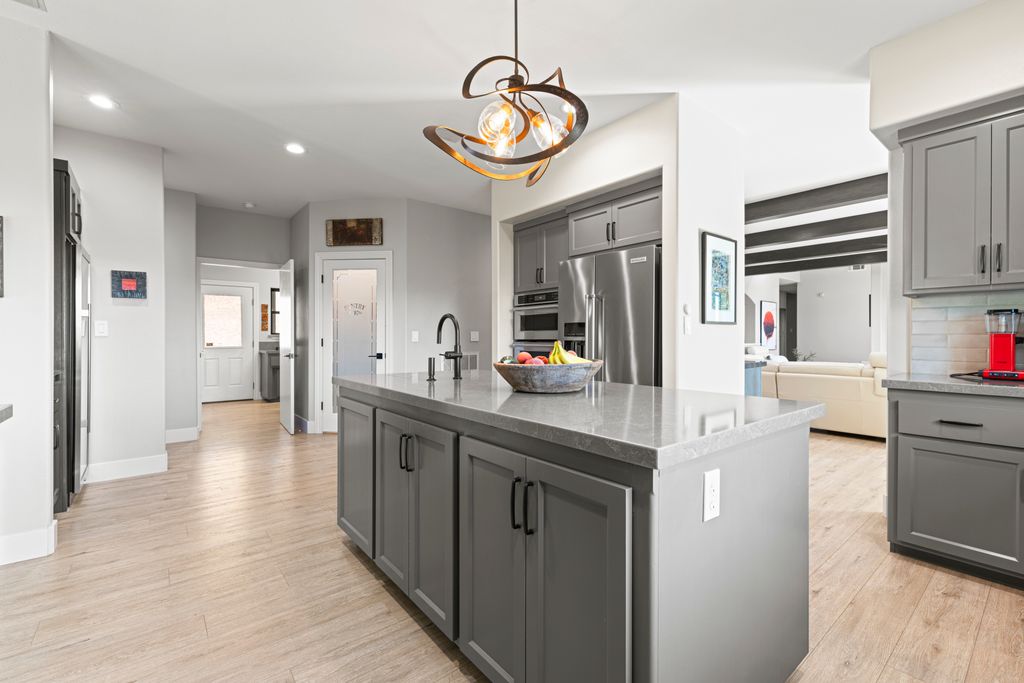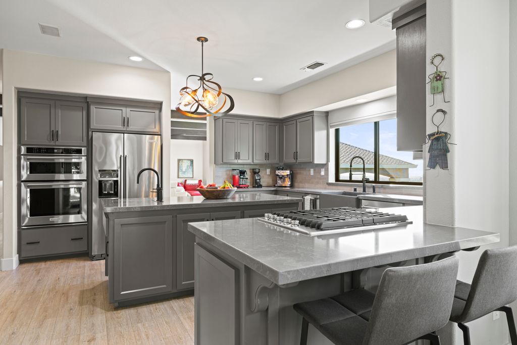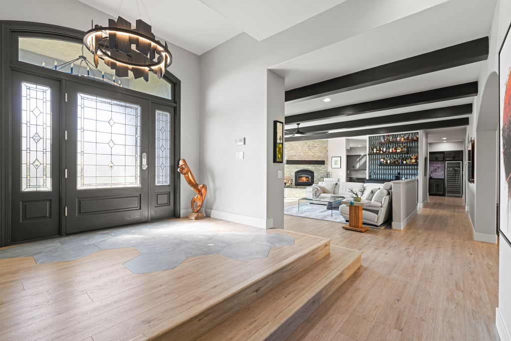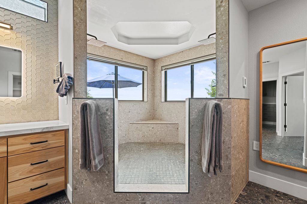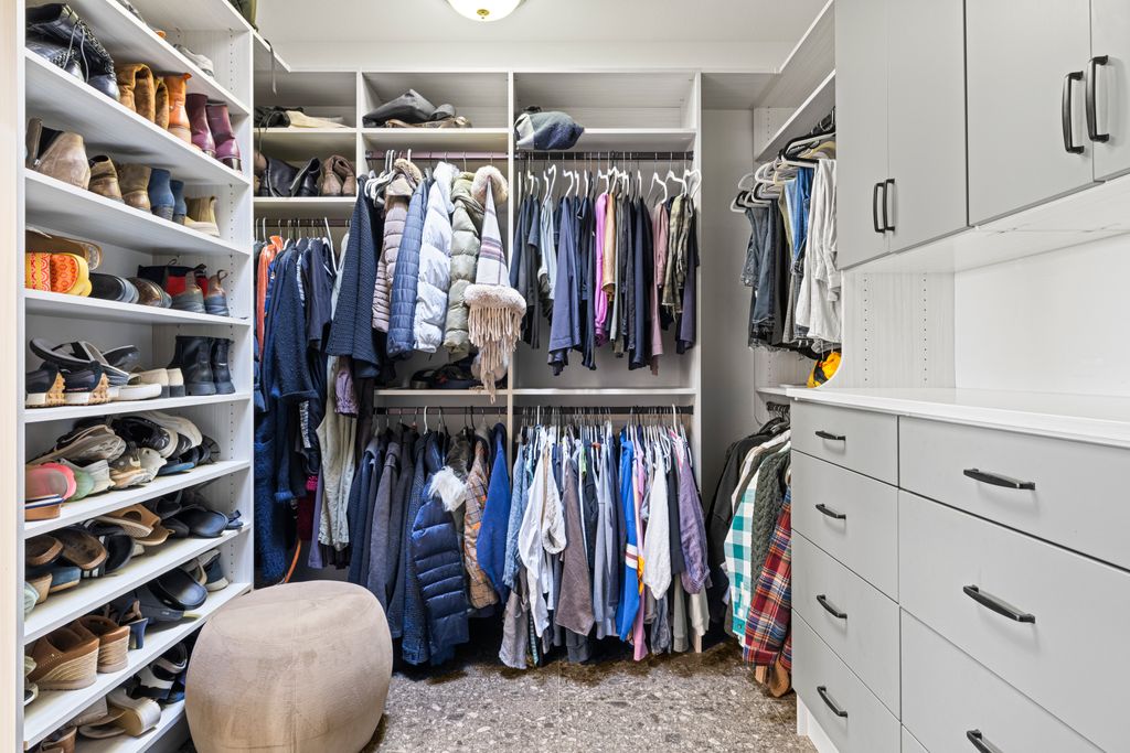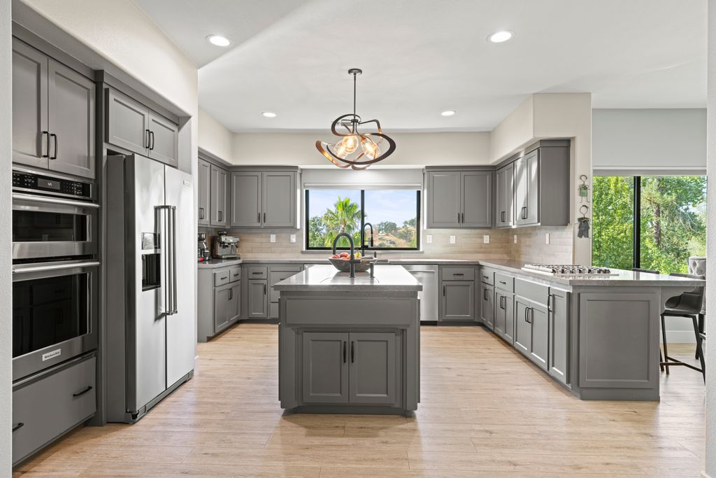 Designed for entertaining and everyday living, the living room features a wood-burning fireplace & built-in bar, flowing seamlessly into the family room, formal dining, & chef’s kitchen. The kitchen is complete with stainless steel appliances, large prep island, walk-in pantry, wine fridge, & adjacent laundry room. The private bedroom wing includes 3 guest rooms (one en-suite) & a luxurious primary suite with its own fireplace, spa-like bath with heated floors, view-framing walk-in shower, & a custom closet.